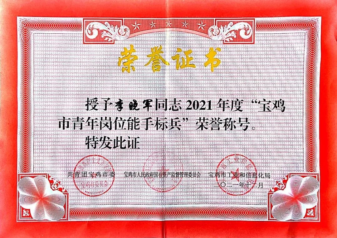 12月17日,伟德体育李晓军被共青团宝鸡市委、宝鸡市人民政府国有资产监督管理委员会、宝鸡市工业和信息化局评为2021年度宝鸡市青年岗位能...