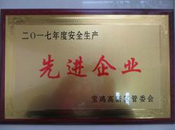 1月25日,公司荣获宝鸡市高新技术产业开发区“2017年度安全生产先进企业”称号;公司专职安全员张莹同志喜获高新区“2017年度安全生产目标考核先进个人”称号。公司和张莹同志自2012年以来,已连续6年获得该项殊荣。