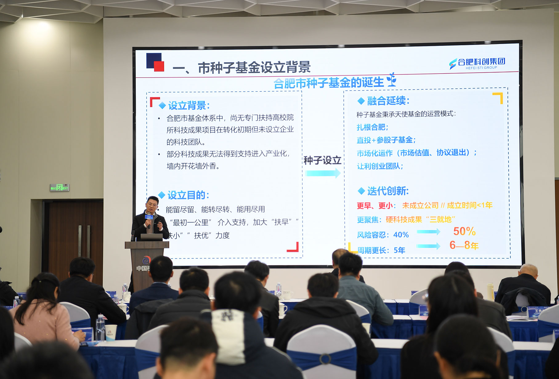 政策宣讲环节,合肥科创集团相关负责人围绕合肥市种子基金进行管理办法解读及运营情况报告。