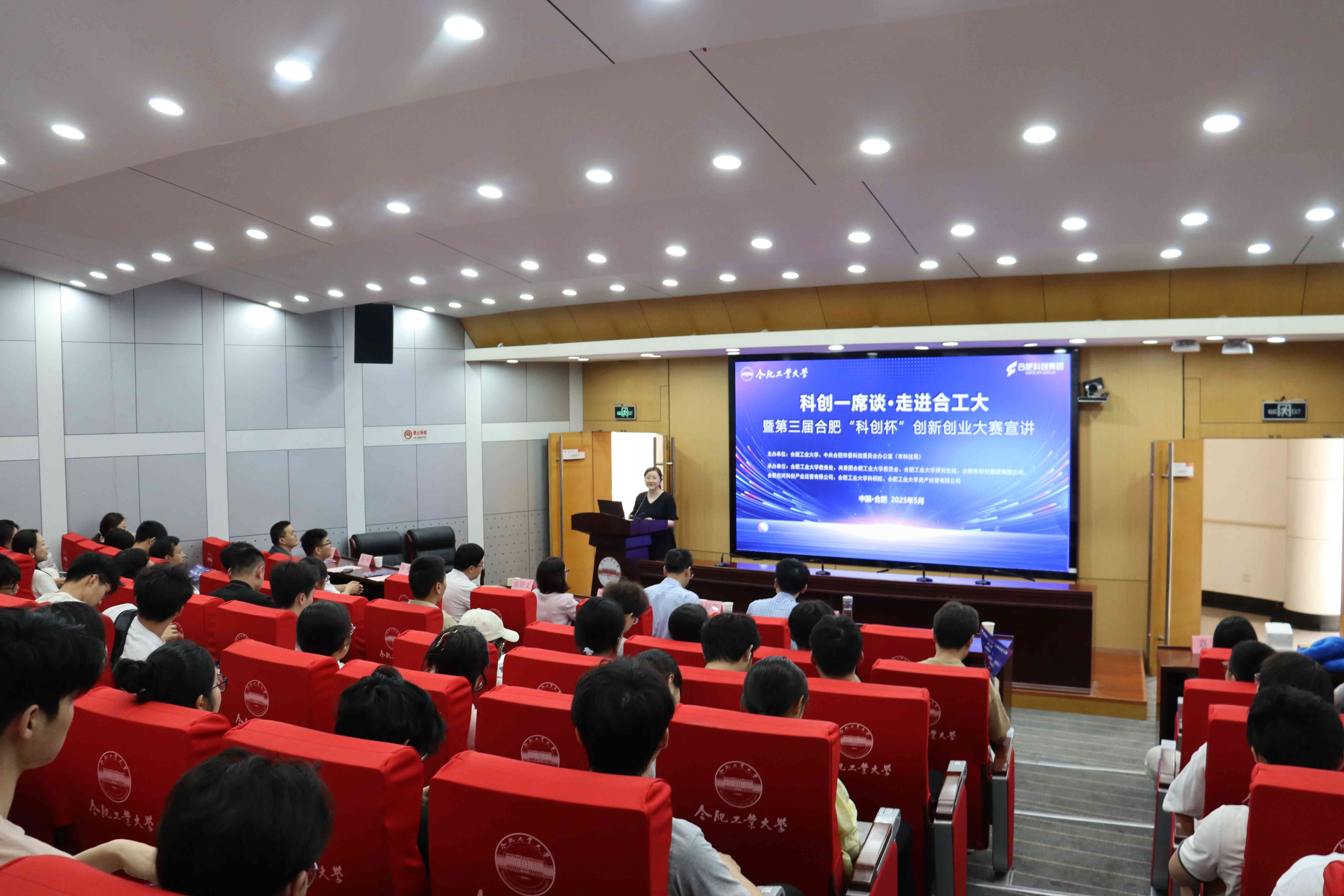 合肥科创集团产业技术部副总经理周燃向广大师生推介第三届“科创杯”赛事,全方位解读赛事流程、参赛要求、报名须知、奖项设置、支持政策等关键信息,并现场解答赛事疑问,气氛热烈。“科技团队报名参赛只是开始,后续我们将提供从种子训练营、政策申报、基金投资、路径规划到品牌推广、场景对接、企业管理的全方位科创服务”,本届赛事为参赛者准备丰厚奖金与优质资源,是科研创新成果走向市场的重要通道,是助力科研人才实现创业梦想的优质平台。